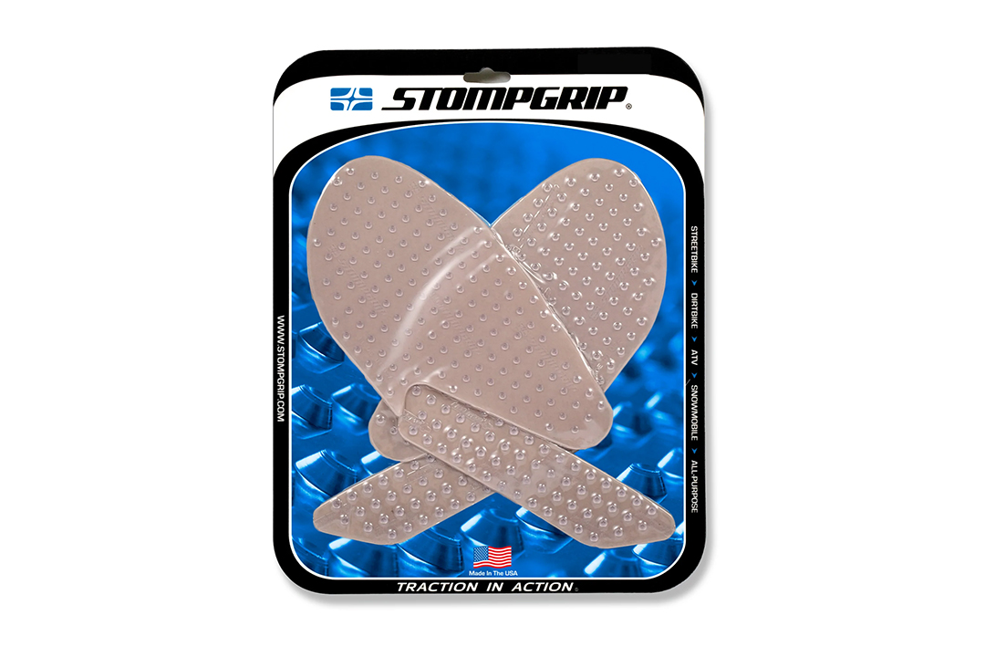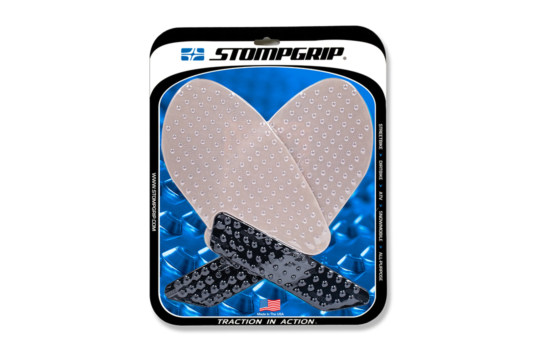 Stompgrip Traction Pads fit individually for every motorcycle. If no suitable Stompgrip pad is available, use the Stompgrip Universal Pads or cut them to size as needed. The pads are available in black or transparent.